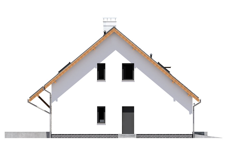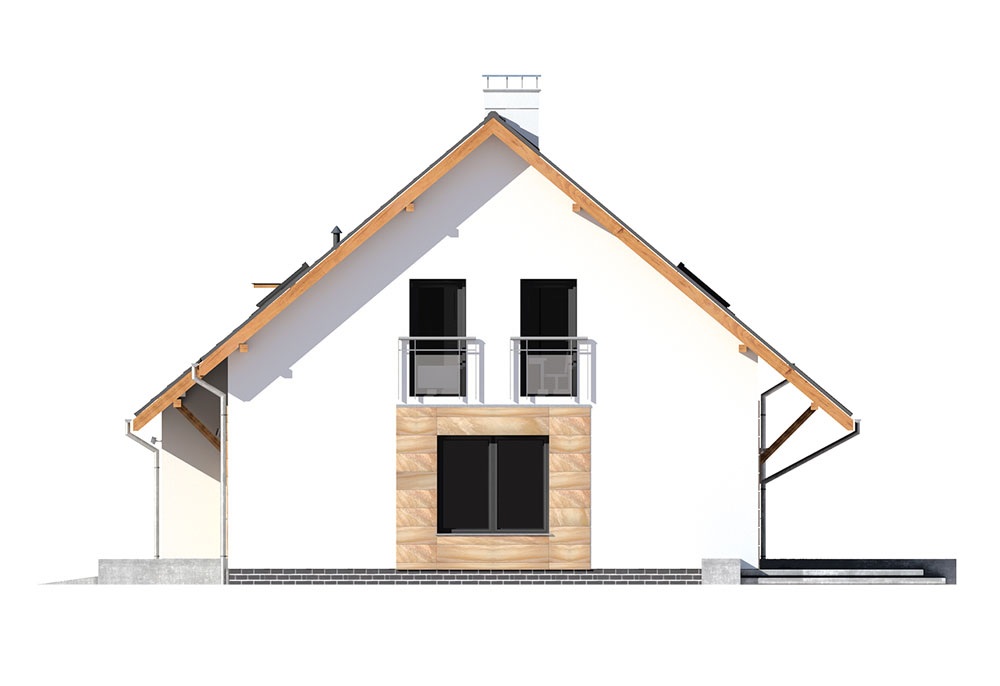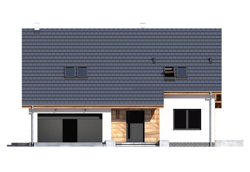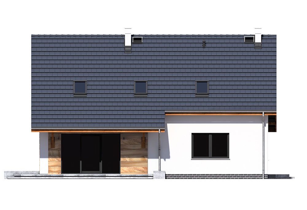 Dom został zaprojektowany dla potrzeb 4-ro lub 5-cio osobowej rodziny. Kompaktowa, zwarta bryła domu jest przekryta dwuspadowym dachem o bardzo prostej konstrukcji drewnianej. Dom zaprojektowano dodatkowo z garażem dwustanowiskowym w bryle budynku. Proste i funkcjonalne wnętrze zakłada strefę dzienną wraz z pokojem gościnnym na parterze oraz w pełni rozkładową strefę nocną na poddaszu. Przestronny, otwierający się na ogród salon z jadalnią dopełniono częściowo zadaszonym tarasem, który doskonale sprawdzi się jako miejsce na letnie posiłki. W budynku zaprojektowano również pomieszczenie kotłowni, standardowo z kotłem na paliwo stałe - ekogroszek, opcjonalnie jest również zaprojektowana instalacja gazu z piecem gazowym. Optymalna wysokość ścianki kolankowej, jaka została zaprojektowana, pozwala na uzyskanie komfortowej powierzchni mieszkalnej na poddaszu i zachowanie idealnych proporcji bryły obiektu. Budynek stanowi kompromis tradycyjnej formy, współczesnej estetyki oraz nowoczesnych materiałów, takich jak elewacyjna okładzina z piaskowca, okładzina klinkierowa, czy szlachetna dachówka ceramiczna. Ponadczasowa architektura tego średniej wielkości domu sprawia, że z łatwością wpisze się w niemal każdy krajobraz.