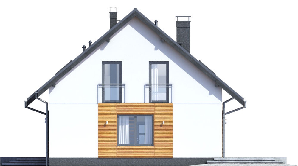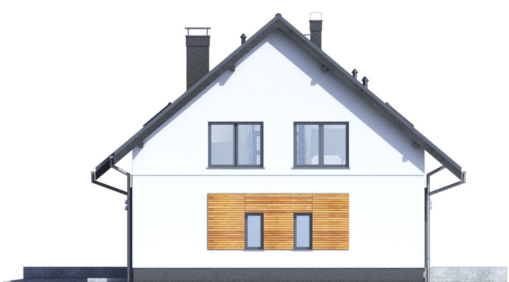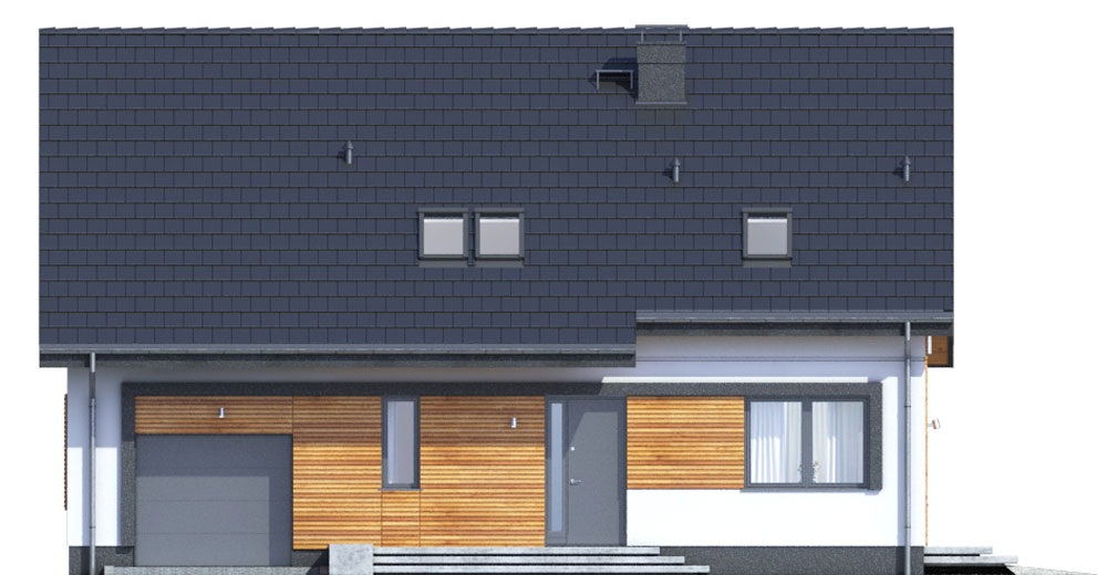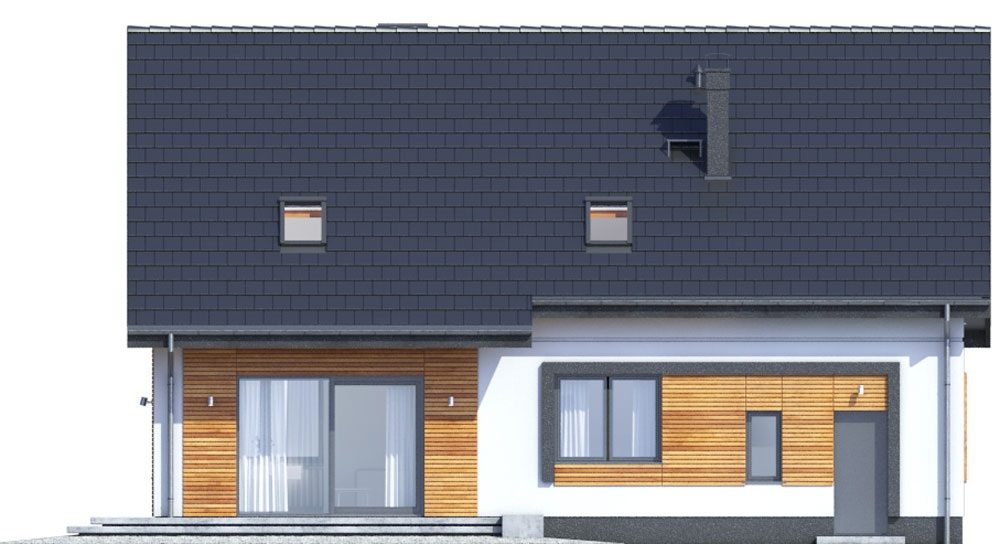 Jest to najlepszy projekt z modelu „Jaskółka”, budynek jest piękny, przytulny i bardzo funkcjonalny. Dom został precyzyjnie zaprojektowany dla potrzeb 4-ro lub 5-cio osobowej rodziny. Kompaktowa, zwarta bryła domu, oparta na rzucie prostokąta, jest przykryta dwuspadowym dachem o bardzo prostej konstrukcji drewnianej. Dom zaprojektowano dodatkowo z bardzo przestronnym garażem jednostanowiskowym wbudowanym bryłę budynku. Proste i bardzo funkcjonalne wnętrze zakłada strefę dzienną wraz z pokojem gościnnym na parterze oraz w pełni rozkładową strefę nocną na poddaszu. Przestronny, otwierający się na ogród salon z jadalnią dopełniono częściowo zadaszonym tarasem, który doskonale sprawdzi się jako miejsce na letnie posiłki. Nad pomieszczeniem garażu i kotłowni znajduje się duży strych użytkowy który można przeznaczyć na dodatkowy pokój lub pomieszczenie rekreacyjne. W miarę potrzeb, pomieszczenie strychu można podzielić na dwa mniejsze pokoje. Optymalna wysokość ścianki kolankowej (106 cm w części mieszkalnej i 163 cm w części strychu), pozwala na uzyskanie komfortowej powierzchni mieszkalnej na poddaszu i zachowanie idealnych proporcji bryły obiektu. Budynek stanowi kompromis tradycyjnej formy, współczesnej estetyki oraz nowoczesnych materiałów, takich jak elewacyjna okładzina drewniana, czy szlachetna, gładka dachówka ceramiczna. Ponadczasowa architektura tego niewielkiego domu sprawia, że z łatwością wpisze się w niemal każdy krajobraz. Dom jest bardzo ekonomiczny w użytkowaniu i korzystny cenowo w budowie, doskonały w swojej prostocie.