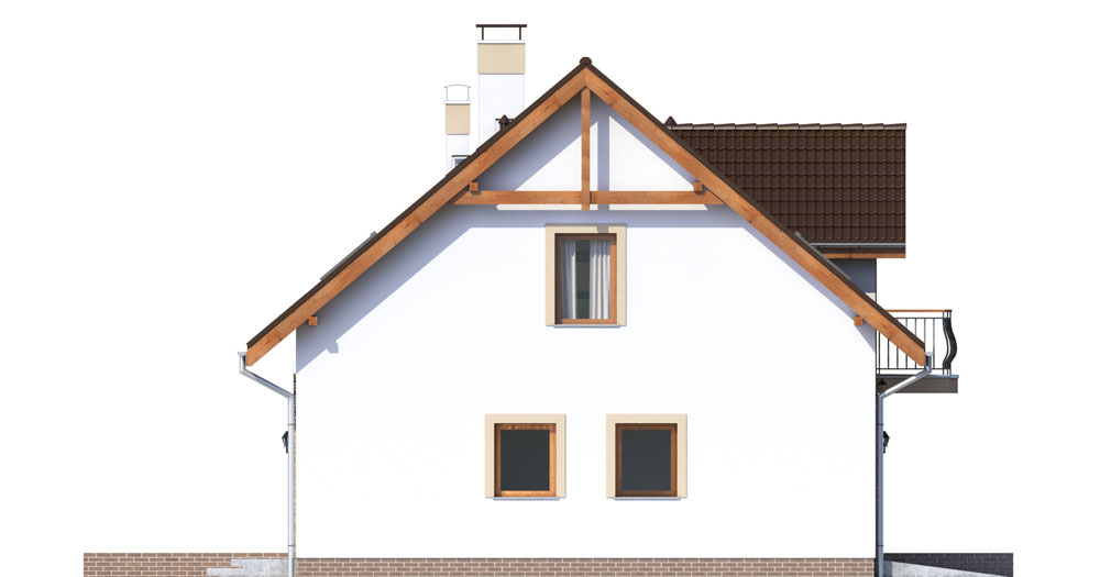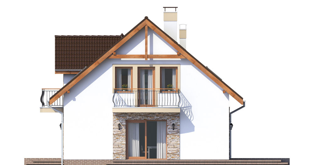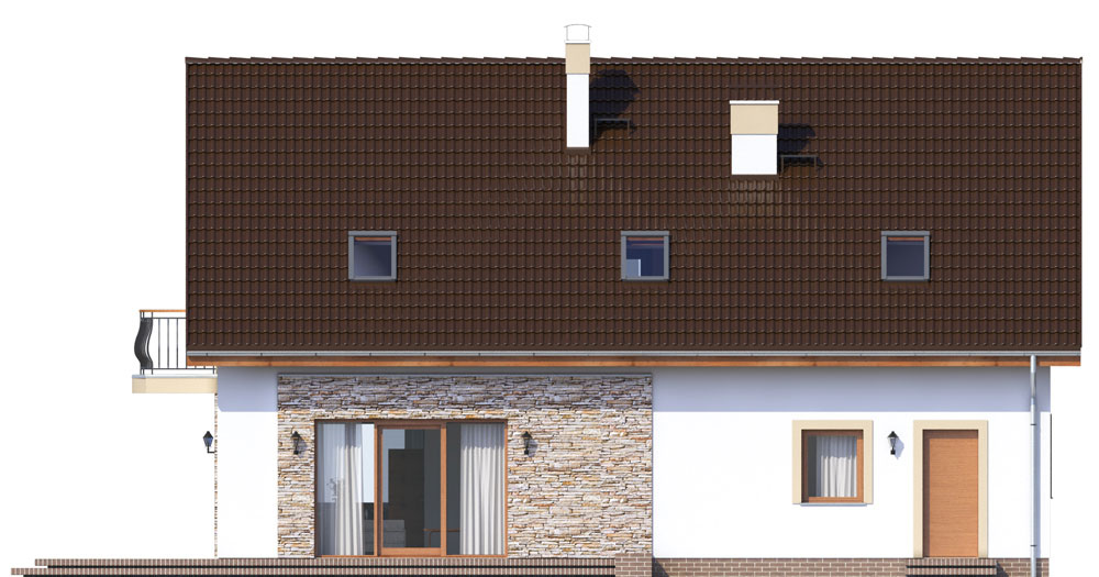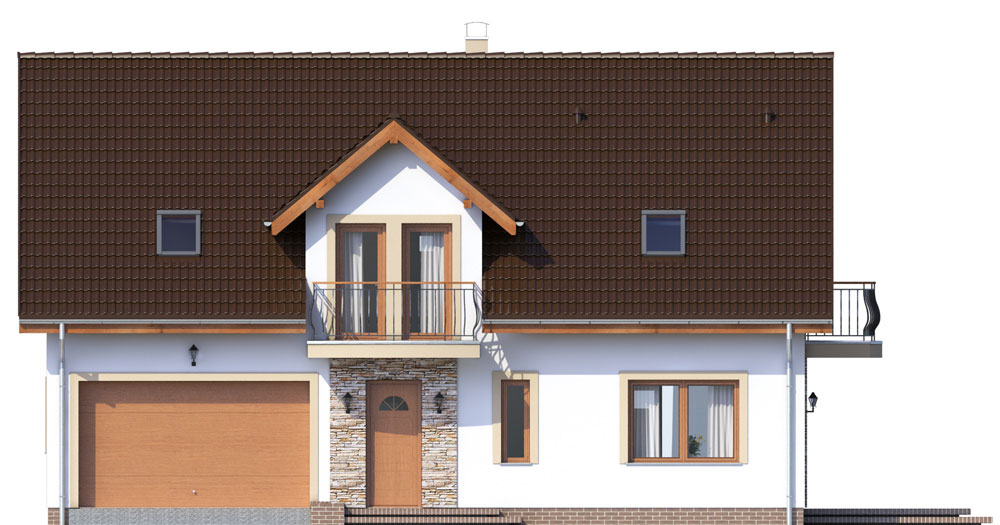 Dom został zaprojektowany dla potrzeb 4-ro lub 5-cio osobowej rodziny. Kompaktowa bryła domu została przekryta dwuspadowym dachem o bardzo prostej konstrukcji drewnianej. Dom zaprojektowano z lukarną i balkonem nad wejściem głównym oraz wbudowanym przestronnym garażem. Zaprojektowano optymalną wysokość ścianki kolankowej co pozwala na uzyskanie komfortowej powierzchni mieszkalnej na poddaszu i zachowanie idealnych proporcji bryły obiektu. Budynek stanowi kompromis tradycyjnej formy i nowoczesnej estetyki oraz materiałów, takich jak elewacyjna okładzina kamienna, naturalne drewno czy szlachetna dachówka ceramiczna. Funkcjonalne wnętrze zakłada strefę dzienną na parterze oraz w pełni rozkładową strefę nocną na poddaszu. Przestronny, otwierający się na ogród salon z jadalnią usytuowano przy wyjściu na taras, który doskonale sprawdzi się jako miejsce na wspólne posiłki. Ponadczasowa architektura tego średniej wielkości domu sprawia, że z łatwością wpisze się w niemal każdy krajobraz.